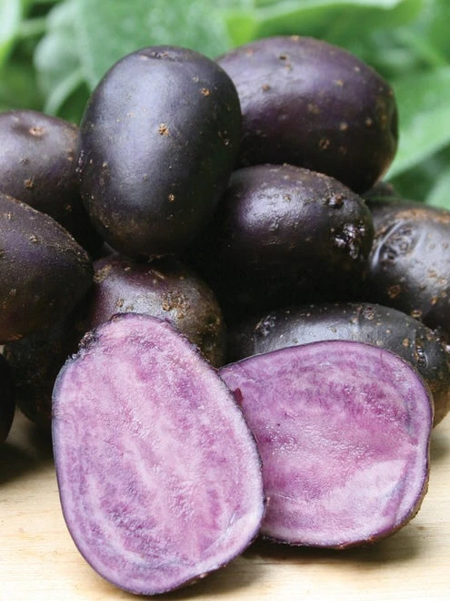 Pick a peck of perfectly purple potatoes. These ever-so-delicious potatoes are purple through and through-with wine-dark skins and succulent purple flesh. The violet-toned, sweet, buttery spuds add pizzazz to potato salads and mixed vegetable dishes. Surprise your next sirloin with a helping of succulent purple steak fries. Formidable!