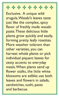 Renee’s Garden exclusive. A unique wild arugula leaves have an incredibly delicious and spicy flavor exactly like freshly made wasabi paste. Easy to grow with pretty edible flowers. More weather tolerant than other arugulas. When plants send up flower stalks, the little white blossoms are edible; use both leaves and flowers in salads, sandwiches, sushi, pasta and barbecue.